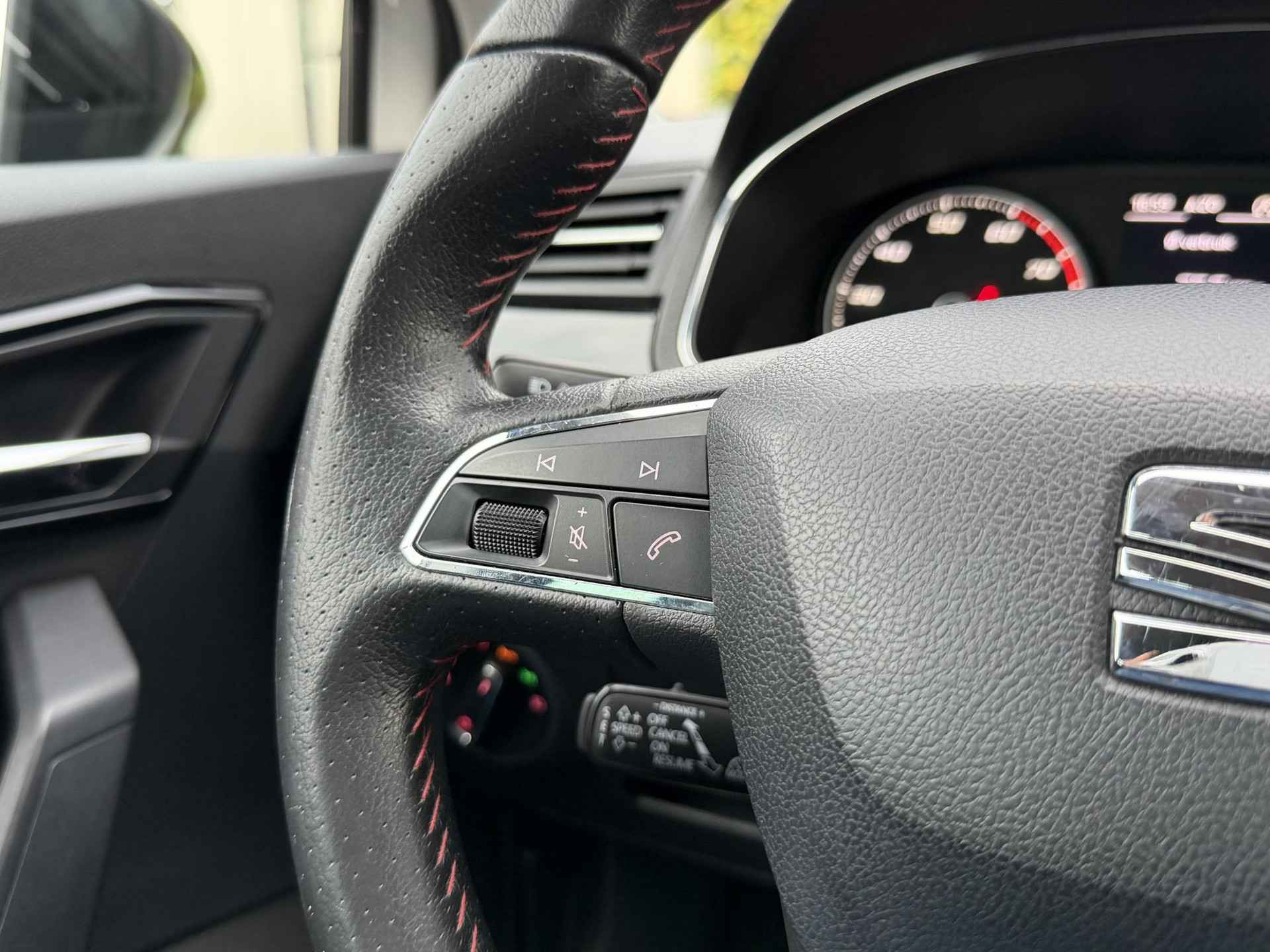 Onder alle omstandigheden perfect zicht op wat zich achter de auto afspeelt: de achteruitrijcamera zorgt ervoor! Adaptive cruise control houdt de ingestelde snelheid vast en houdt automatisch afstand tot uw voorligger. Ook de akoestiek in de auto wordt optimaal benut door het high performance audiosysteem. Bij de luxe van deze auto hoort ook automatische airconditioning. Het drukke verkeer eist onderweg al uw aandacht op. Daarom is het goed dat deze SEAT is voorzien van diverse systemen die u assisteren tijdens de rit. Een automatisch inschakelbare verlichting neemt het waar als het donker wordt of gaat schemeren, en schakelt dan automatisch de verlichting in. Op dezelfde manier "ziet" de regensensor de eerste spatjes regen en schakelt dan de ruitenwissers in, en als het harder gaat regenen zet hij de ruitenwissers ook in een snellere stand. U bent in deze SEAT ook voorzien van dashboard met spraakbediening, full map navigatiesysteem, DAB ontvangst, keyless entry, automatisch dimmende binnenspiegel en lederen stuur.